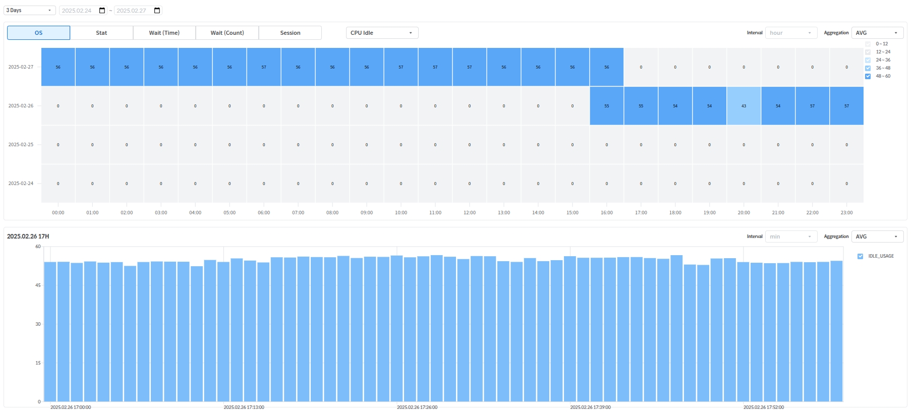 Heatmap Trend 화면에서는 선택한 인스턴스의 Resource 사용량에 대한 Overview를 확인할 수 있다. 이때 지정한 구간 동안 시간, 일자별로 Resource 사용량을 도식화하여 한눈에 확인할 수 있고, 선택한 시간의 분 단위 막대 그래프로 정밀하게 전체적인 사용량의 흐름을 알 수 있다.