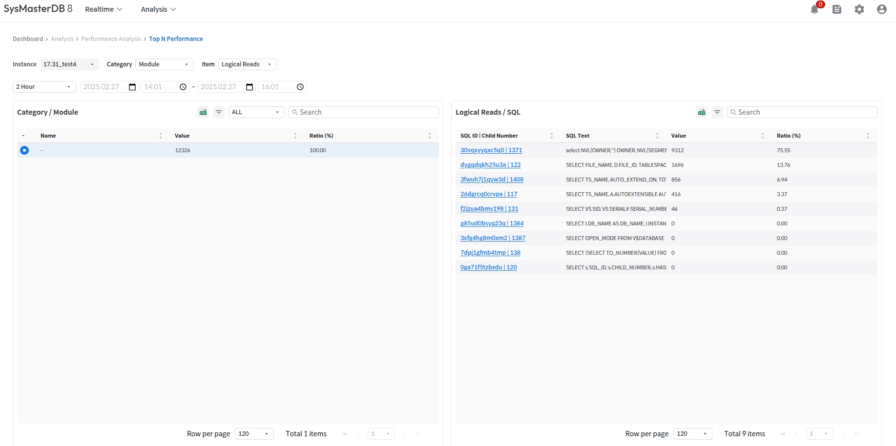Category / Module에서 발생한 SQL 중 Item(Logical Reads) 값(Value)이 높은 순서대로 출력한다. 이 때 해당 SQL을 더블 클릭하면 SQL Detail 화면으로 넘어간다.
