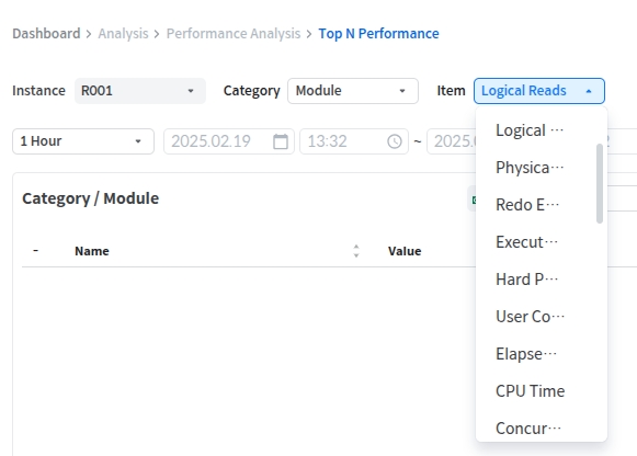 Category와 Item 선택을 통해 모니터링 하고자 하는 기간에서의 성능 지표를 확인할 수 있다. 이때 영역 오른쪽 상단의 콤보박스를 통해 SQL Category를 제외한 Category에 대해 정렬 리스트의 개수(ALL / Top 20 / Top 30 / Top 50)를 지정할 수 있다.