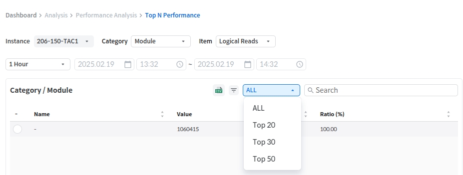 글로벌 내비게이션 바에서 [Analysis] > [Performance Analysis] > [Top N Performance] 메뉴를 클릭하면 Top N Performance 화면이 열린다.