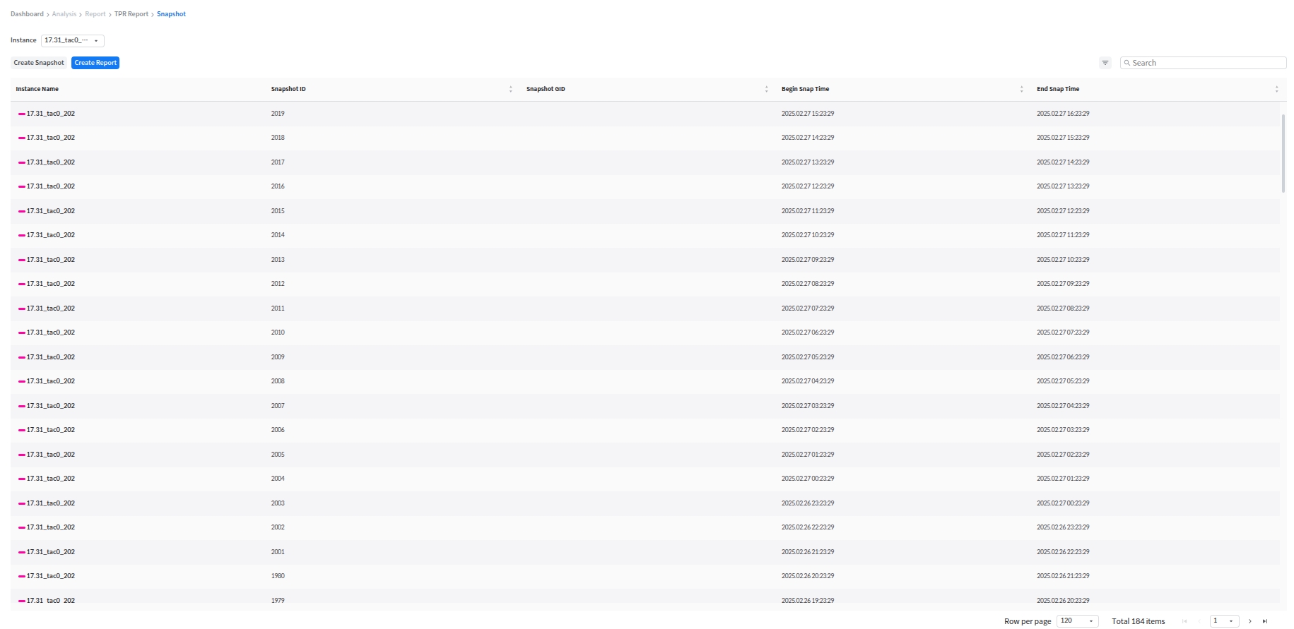 [TPR Report] 페이지에서 Snapshot 버튼을 통해 특정 인스턴스의 Snapshot 목록을 조회하거나 생성할 수 있다. 선택한 Snapshot ID 로 리포트를 생성할 수 있다.
