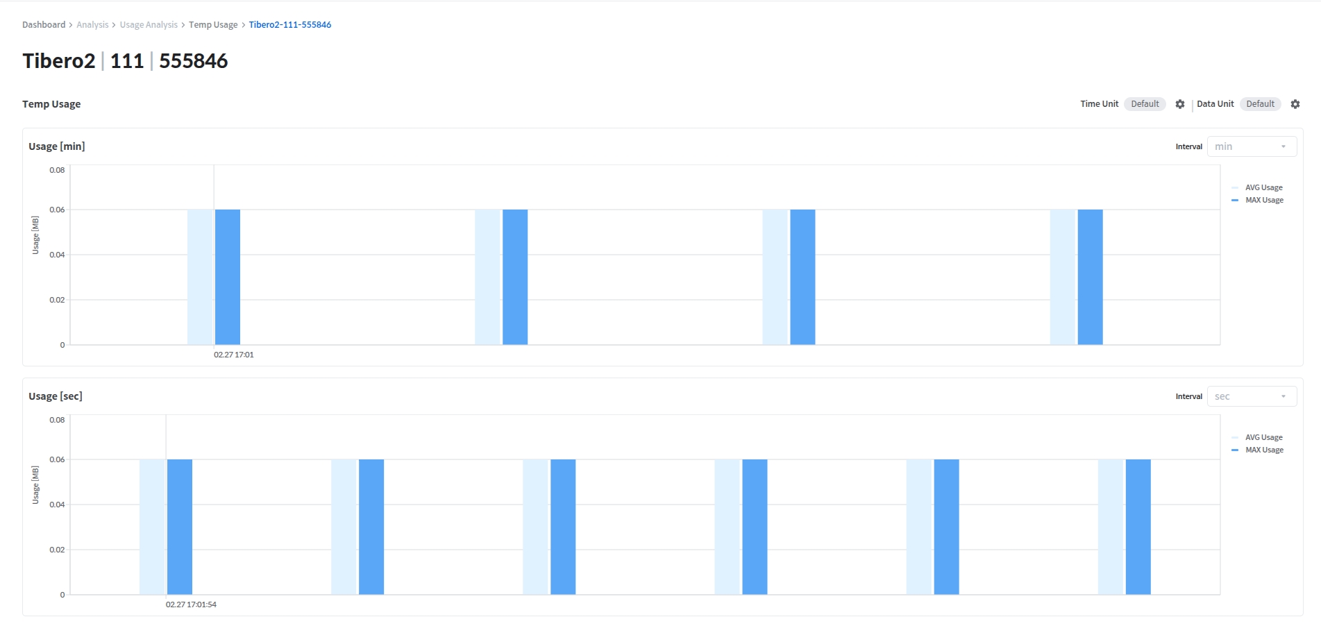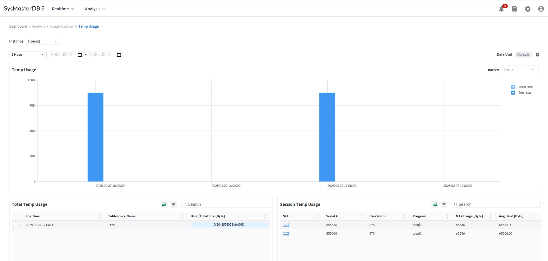 글로벌 내비게이션 바에서 [Analysis] > [Usage Analysis] > [Temp Usage] 메뉴를 클릭하면 Temp Usage 화면이 열린다.