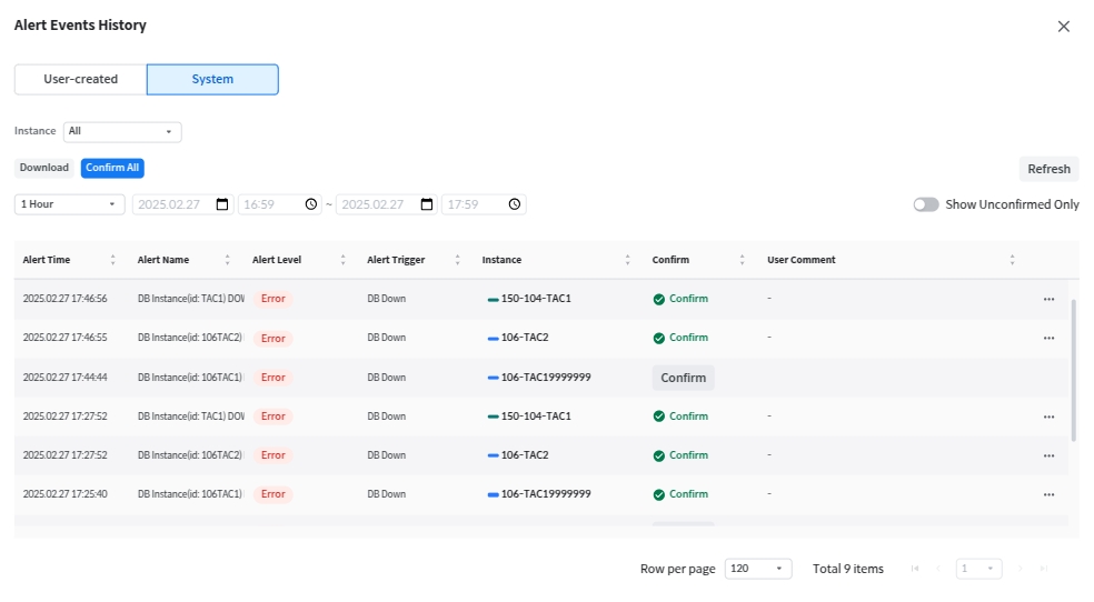 User Created Alert 및 System Alert 모두 확인 할 수 있으며, Alert가 발생한 시각, Alert 이름, Alert 레벨, Alert가 발생한 인스턴스, Confirm 여부 및 Alert 확인시 작성한 유저 Comment 이력을 확인 할 수 있다.