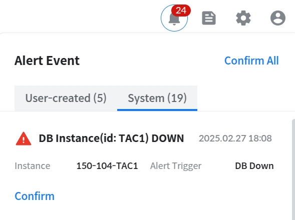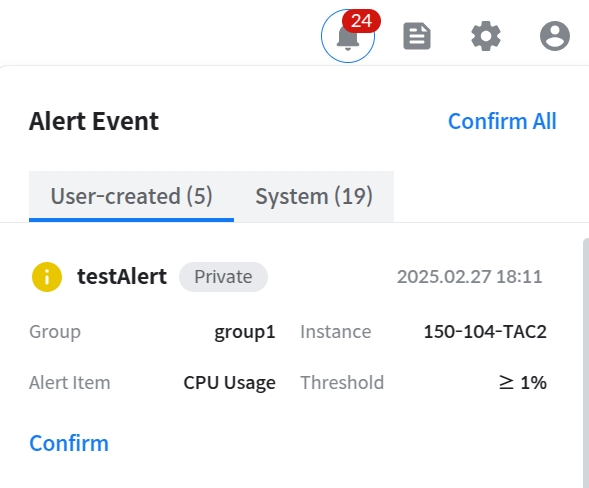 각 Alert에 대해 Confirm 처리를 하거나, 우상단에 Confirm All 버튼을 눌러야 Alert Event를 제거할 수 있다.