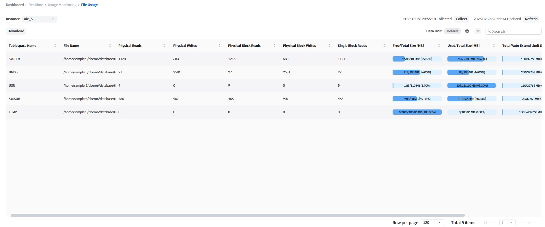 File Usage 페이지에서는 데이터 파일 사용량 정보를 보여준다. File Usage 는 관제 DB 에 대한 부하를 최소화하기 위해 한시간마다 수집되는데, 우 상단 [Collect] 버튼 클릭시 최신 File Usage 정보를 수집하여 보여준다.