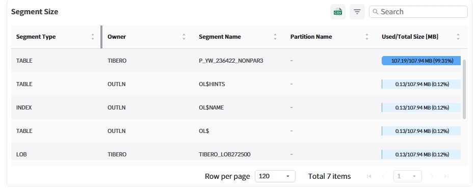 Tablespace Usage 페이지에서는 테이블스페이스 사용량 정보를 보여준다.