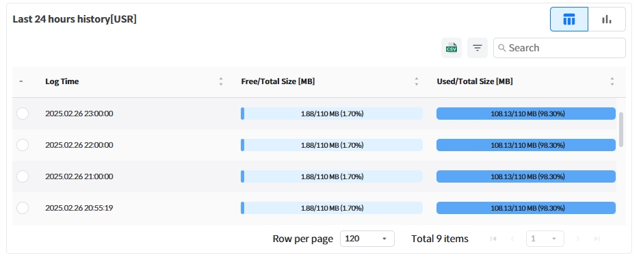 Last 24 hours history 에서는 그리드(Grid) 형태로 현재까지의 사용량 정보를 확인하거나, 차트(Chart) 형태로 변화율 추이를 확인할 수 있다.