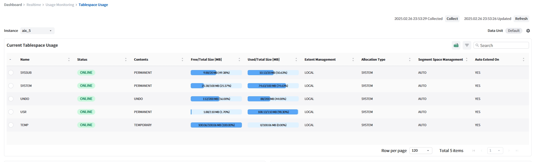 글로벌 내비게이션 바에서 [Realtime] > [Usage Monitoring] > [Tablespace Usage] 를 클릭하면 Tablespace Usage 페이지가 열린다.