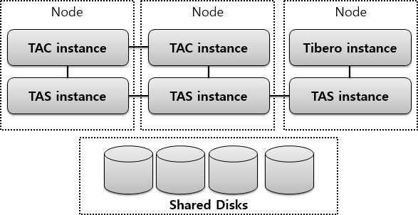 TAS provides a clustering function for using a shared disk. Only one Tibero instance can use a disk space. In order for multiple Tibero instances to use a disk space, the instances must be configured in TAC.