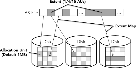 TAS files are stored in a disk space as a set of extents. Each extent is stored in each disk of a disk space, and each extent uses one or more allocation units. To support large-sized files, TAS uses variable size extents, which reduces the memory required for maintaining file extent information.
