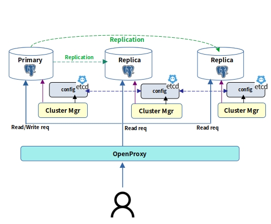 OpenHA Cluster Manager Patroni 기반의 클러스터 관리 모듈로, 각 데이터베이스 노드의 상태를 실시간 감지하고 자동 Failover, Primary 노드 선출, 구성 변경 관리 기능을 수행한다.